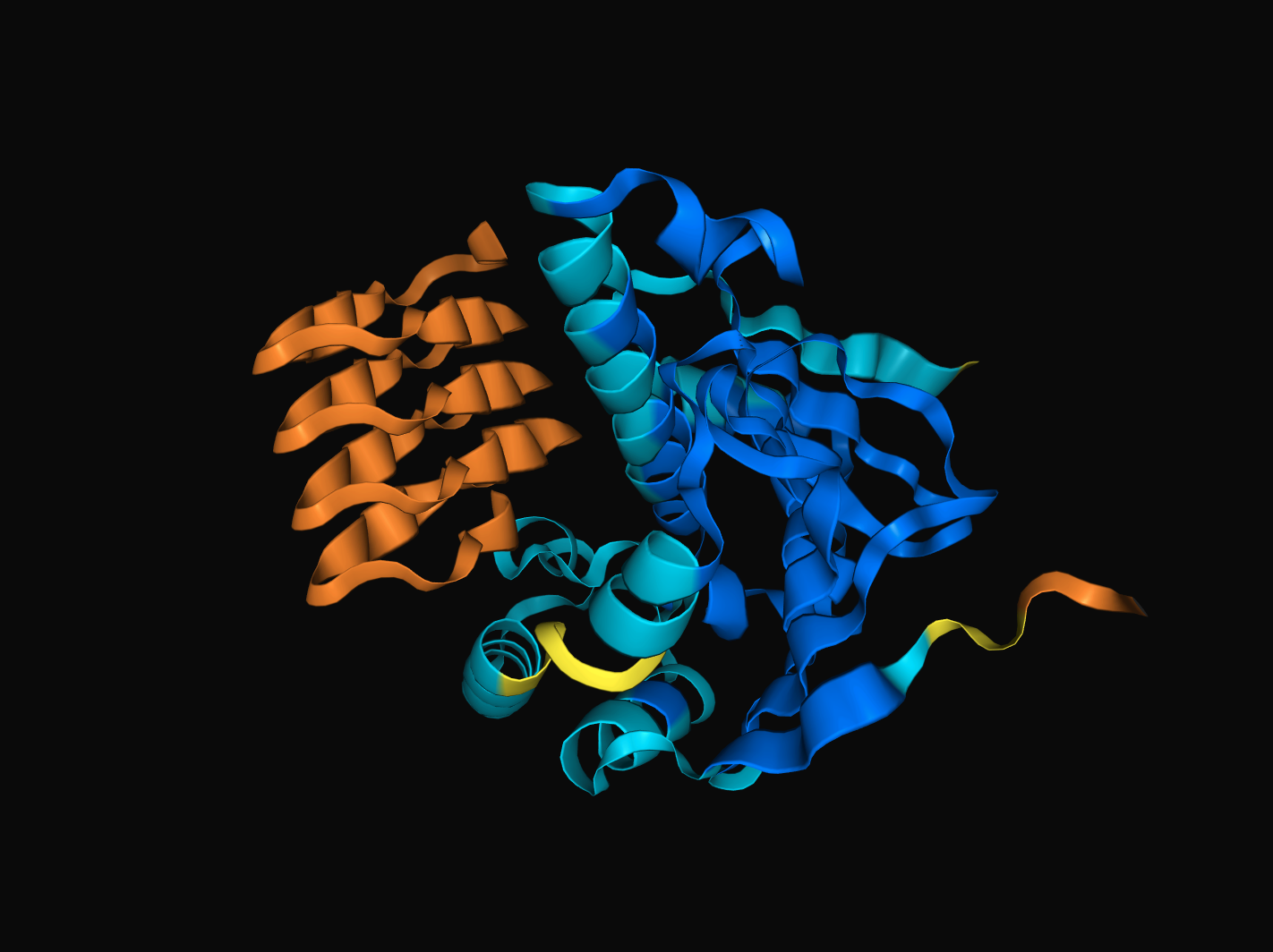 그렇게 RCSB Protein Data Bank에서 수많은 단백질을 탐색하는 시간을 가졌습니다. 결국 비교적 단순한 구조를 가진 ACK1 단백질인 “4HZS”를 잠정 파트너로 정했습니다. 이 단백질은 341개의 아미노산 서열(GSQSLTCLIGE ... TSVAGLSAQD)로 이루어져 있는데, 세포 신호 전달에서 다양한 역할을 하는 인산화 효소입니다.