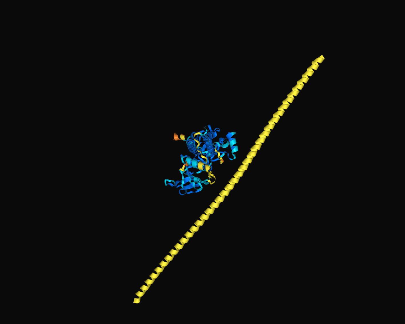 보통은 아래 이미지의 노란 코일과 같이 곧게 펴진 형태로 나타납니다. 더 정확히 표현하면, 그렇게 “나타난다”라기보다는 AlphaFold가 해당 서열에 대한 유의미한 접힘 구조를 찾을 수 없는 것이라고 볼 수 있습니다.