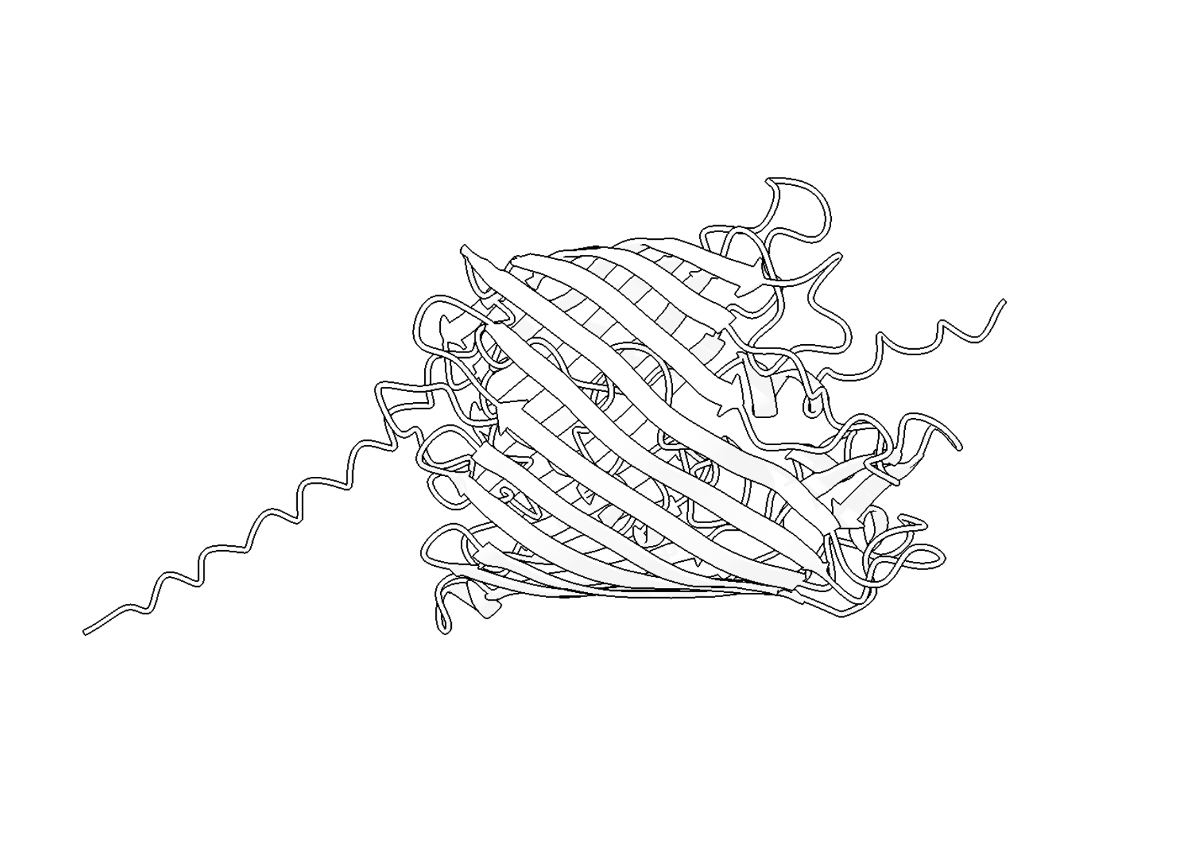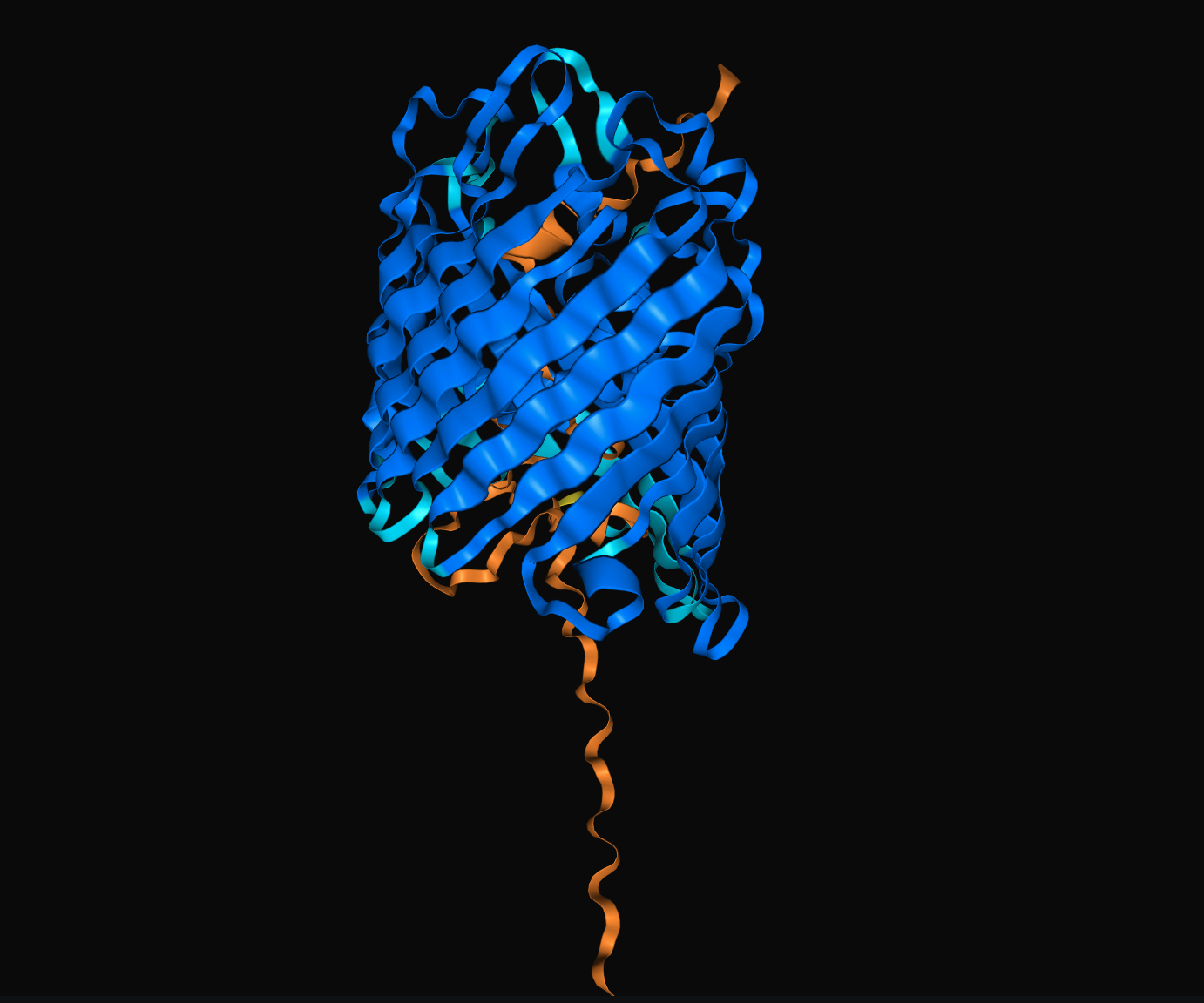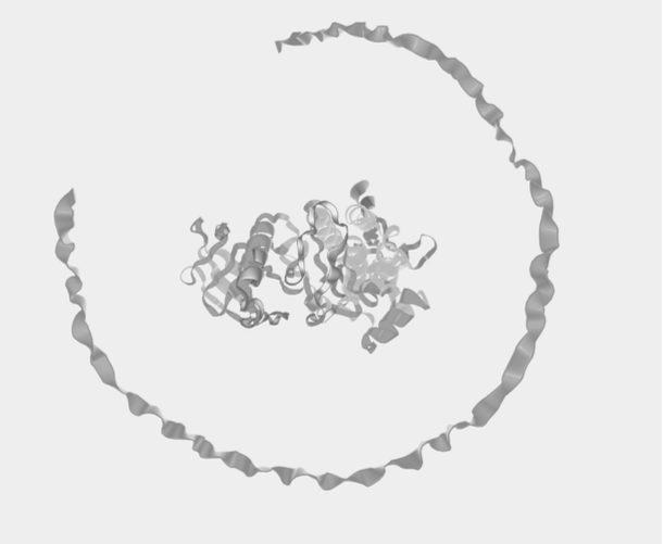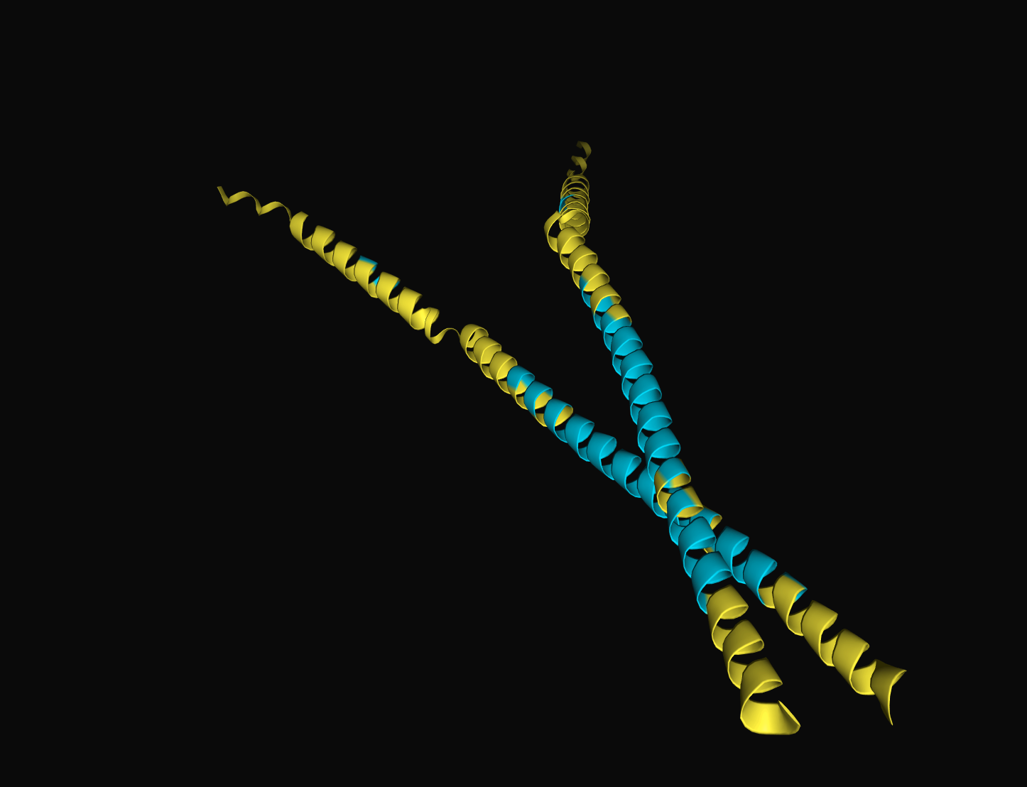 노란 코일 옆에 놓인 것은 실제로 존재하는 한 단백질의 모습입니다. 둘 사이의 상호작용은 없는 상태입니다.