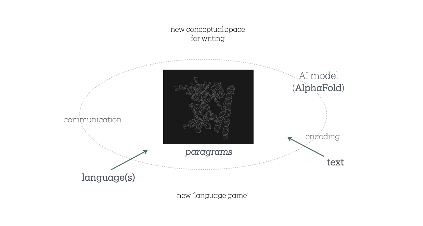 이러한 구조적 유사성에 기반해 AlphaFold에서 임의의 자연어 단어를 다른 단백질과 함께 접히게끔 만드는 실험을 할 수 있습니다. 이는 물론 AlphaFold의 원래 목적과 거리가 먼 '목적 외적(para-functional)' 사용입니다. ‘재전유’라고 표현할 수도 있습니다. 특히 AI 모델을 단순한 예측 도구가 아닌 새로운 개념적 쓰기(conceptual writing)의 공간으로 재구성하는데 목적이 있습니다.
